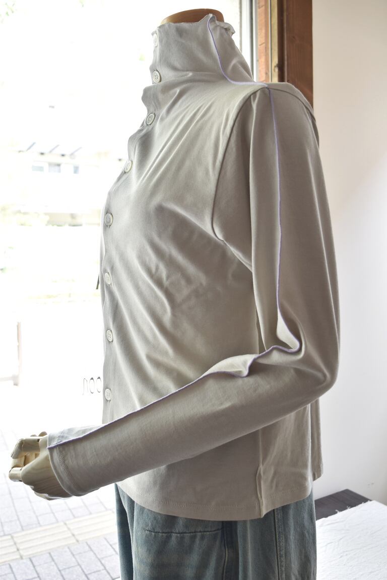 コンパクトなフォルムのボトルネックカーディガンで、随所にみせたメロー始末が軽さと女性らしさを演出。
