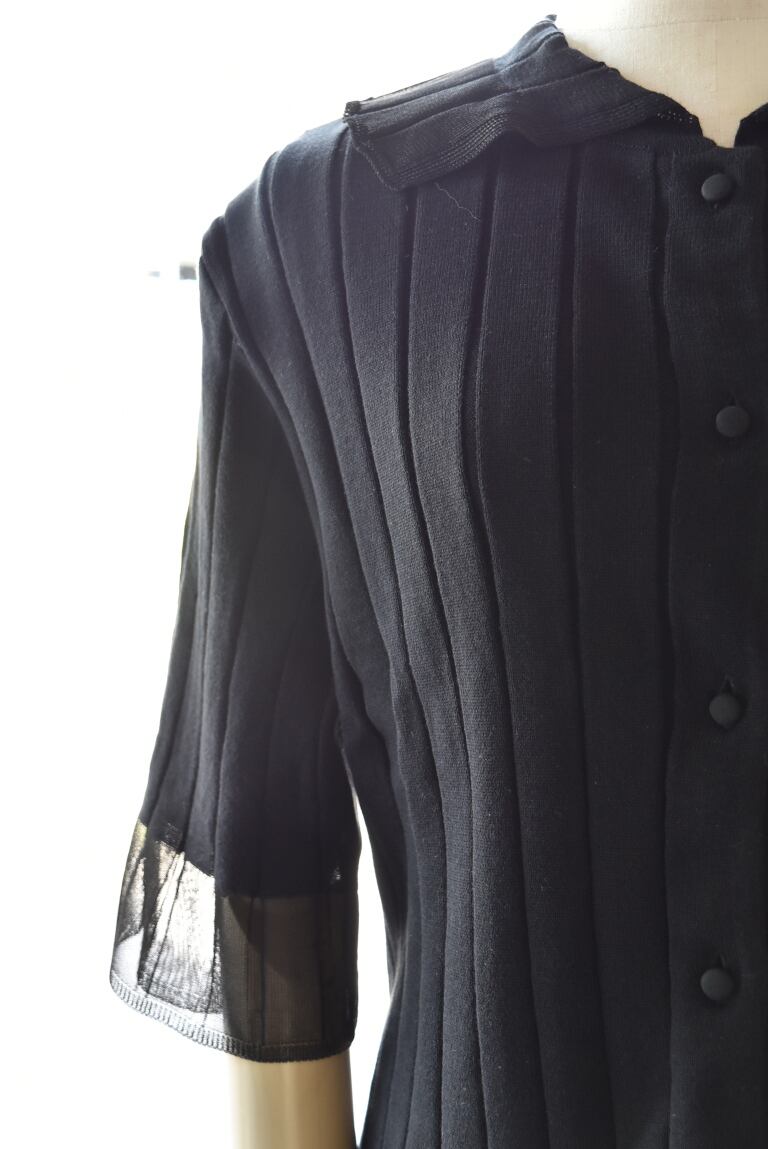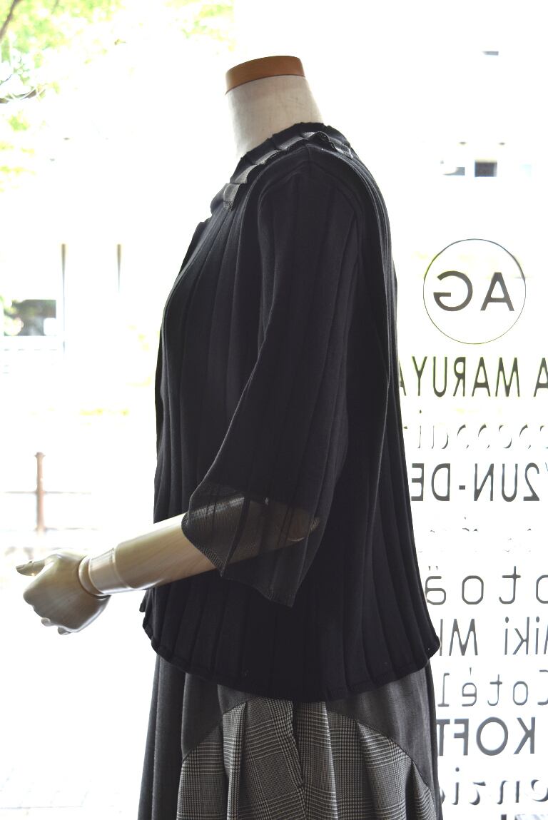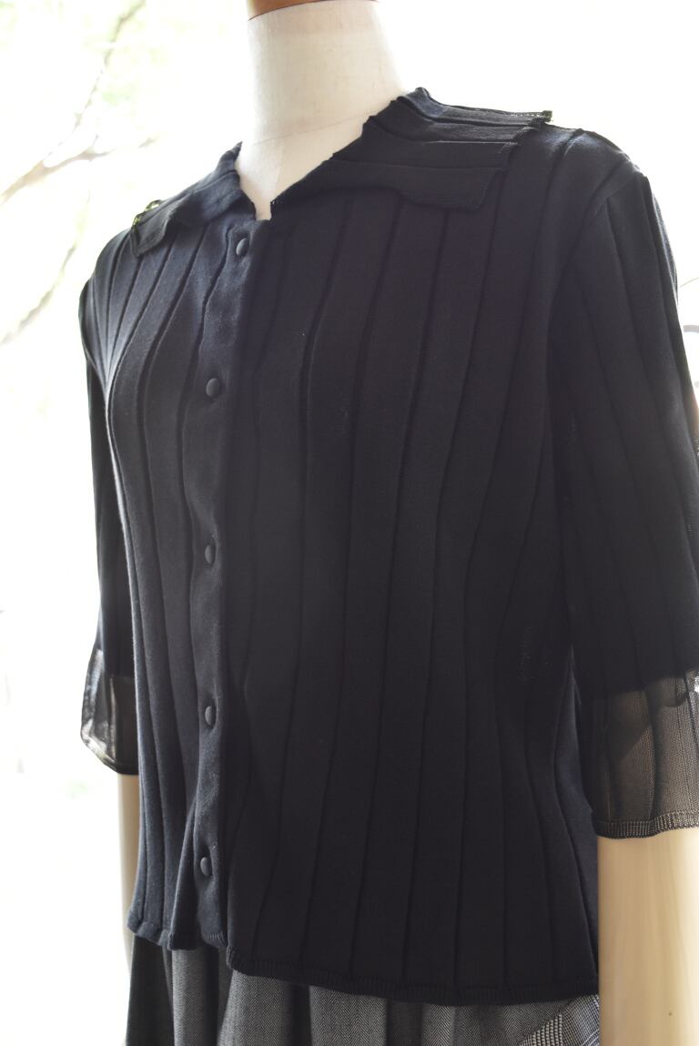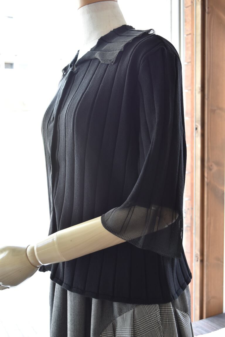 袖口と襟先部分の透け感がある編み地は、細い番手のナイロンとポリエステル糸を使用しており、シアーなニット部分は清涼感があり爽やかな印象です。