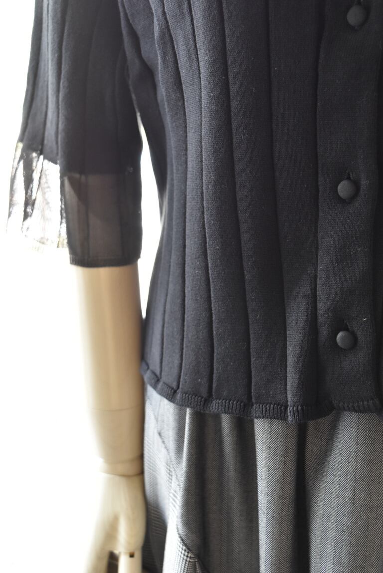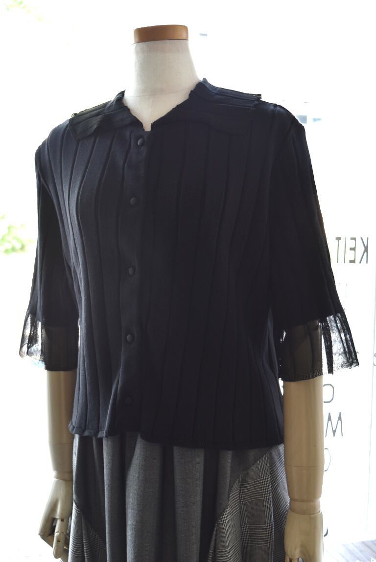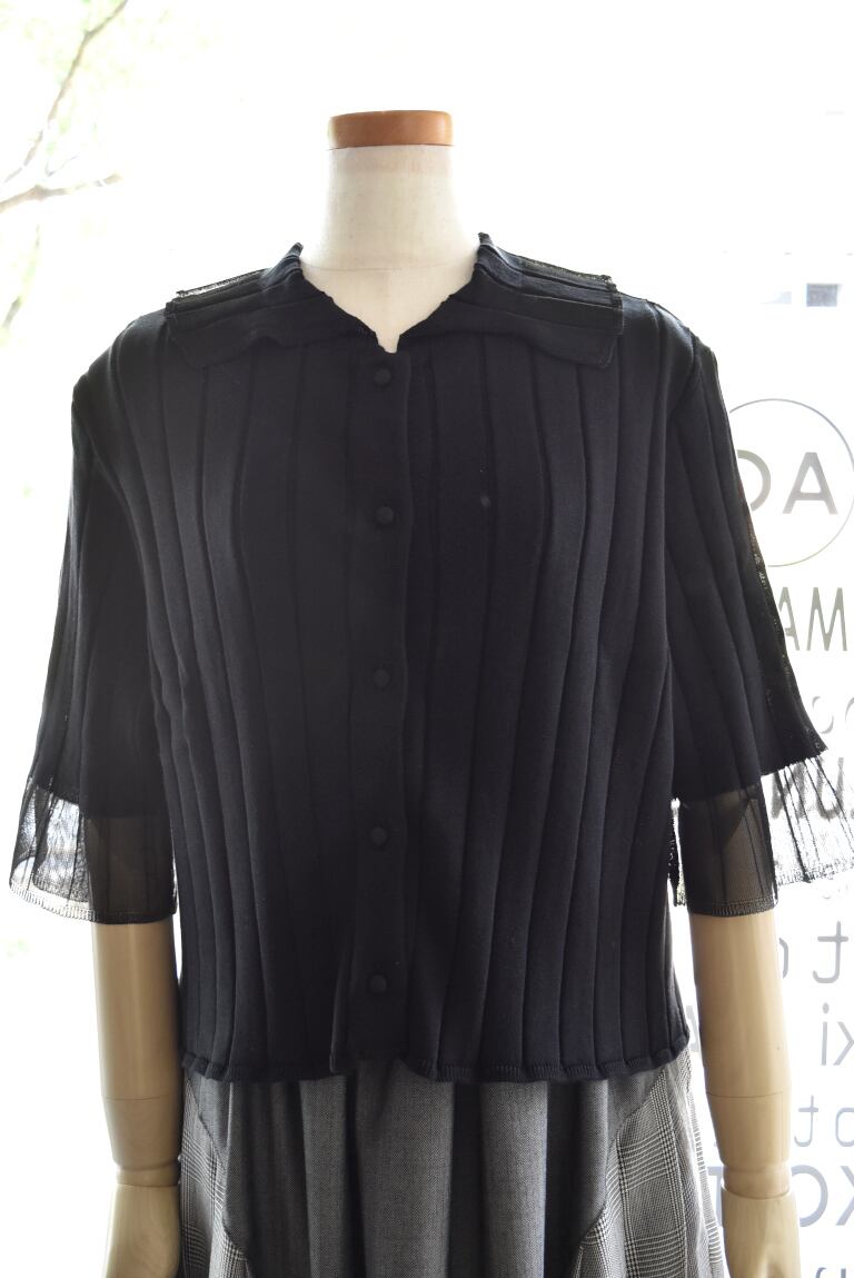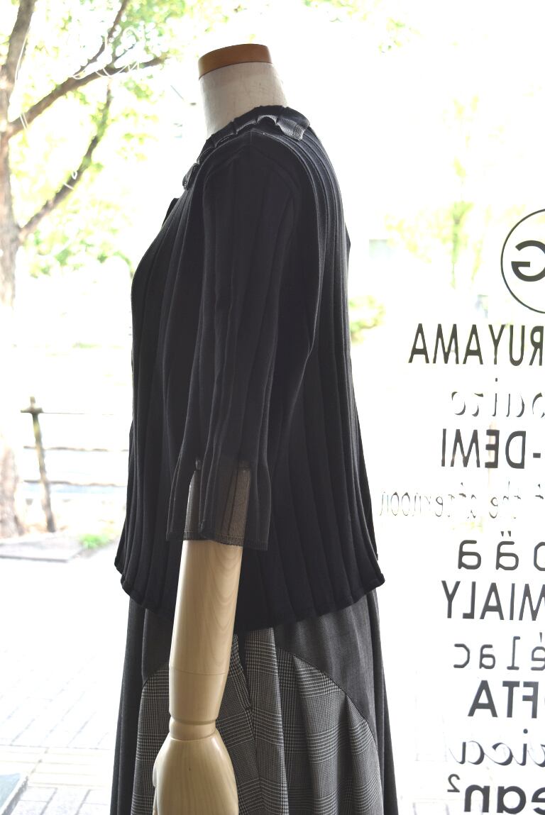 袖口と襟先部分の透け感がある編み地は、細い番手のナイロンとポリエステル糸を使用しており、シアーなニット部分は清涼感があり爽やかな印象です。