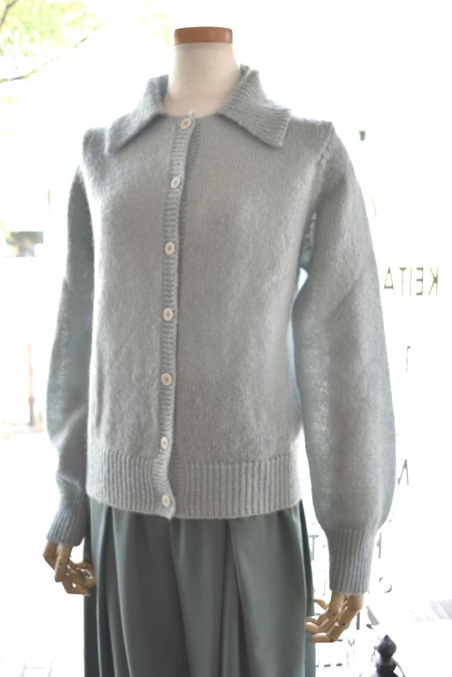 100番双糸の糸を使って編み上げた前ボタン開きのニットです。