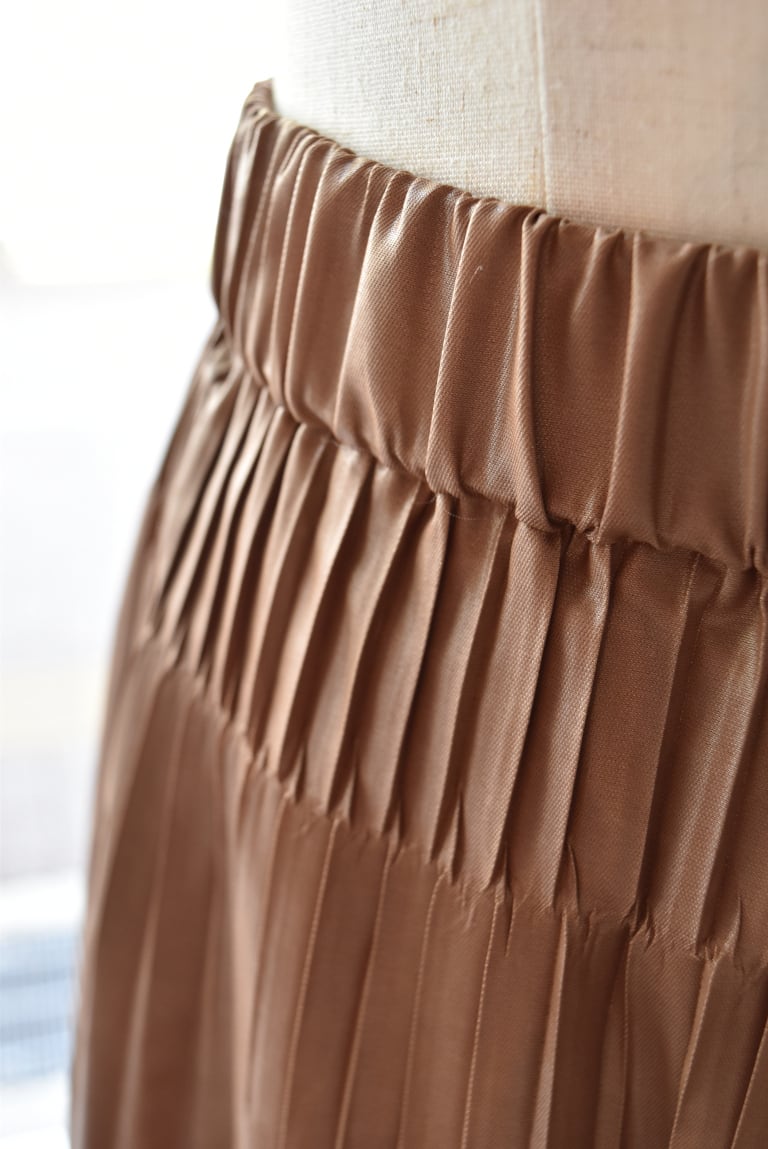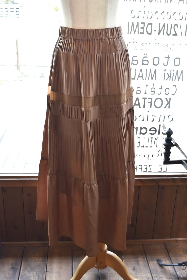 なびく様がエレガントなハリケーンプリーツという変則的な消しプリーツ加工を贅沢にも3段使用した特別館のあるプリーツスカート。