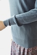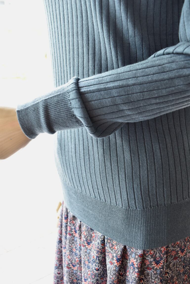 定番の形で、リブですがフィットしすぎないサイズ感と、衿に圧迫感がない編み地にし、着心地のよいシルエットに仕上げています。