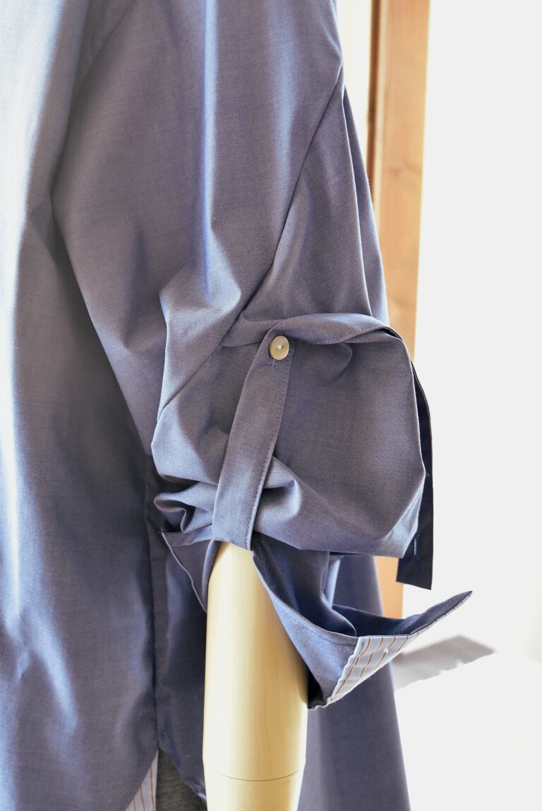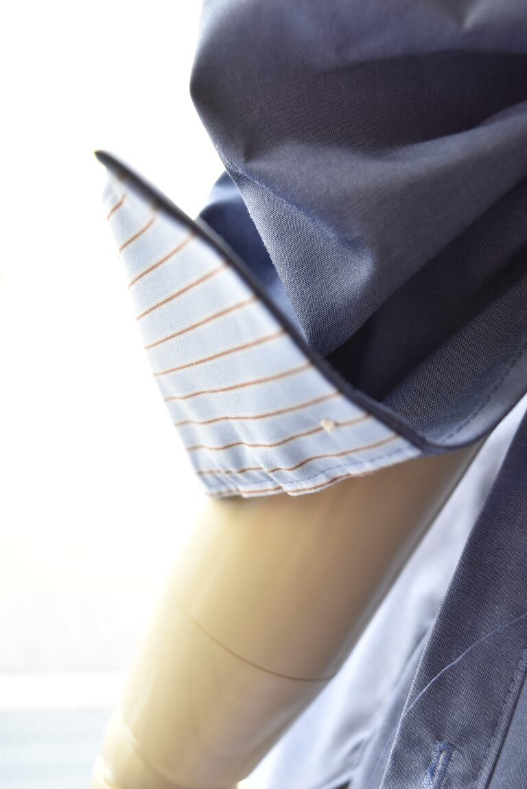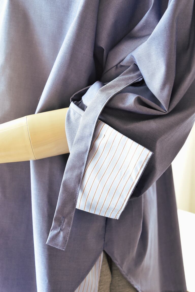 袖についたベルトでブラウジングすれば、袖にボリューム感をプラスしつつカフスの内側に切り替えたストライプ柄が出現し、手元に動きと抜け感を与えます。