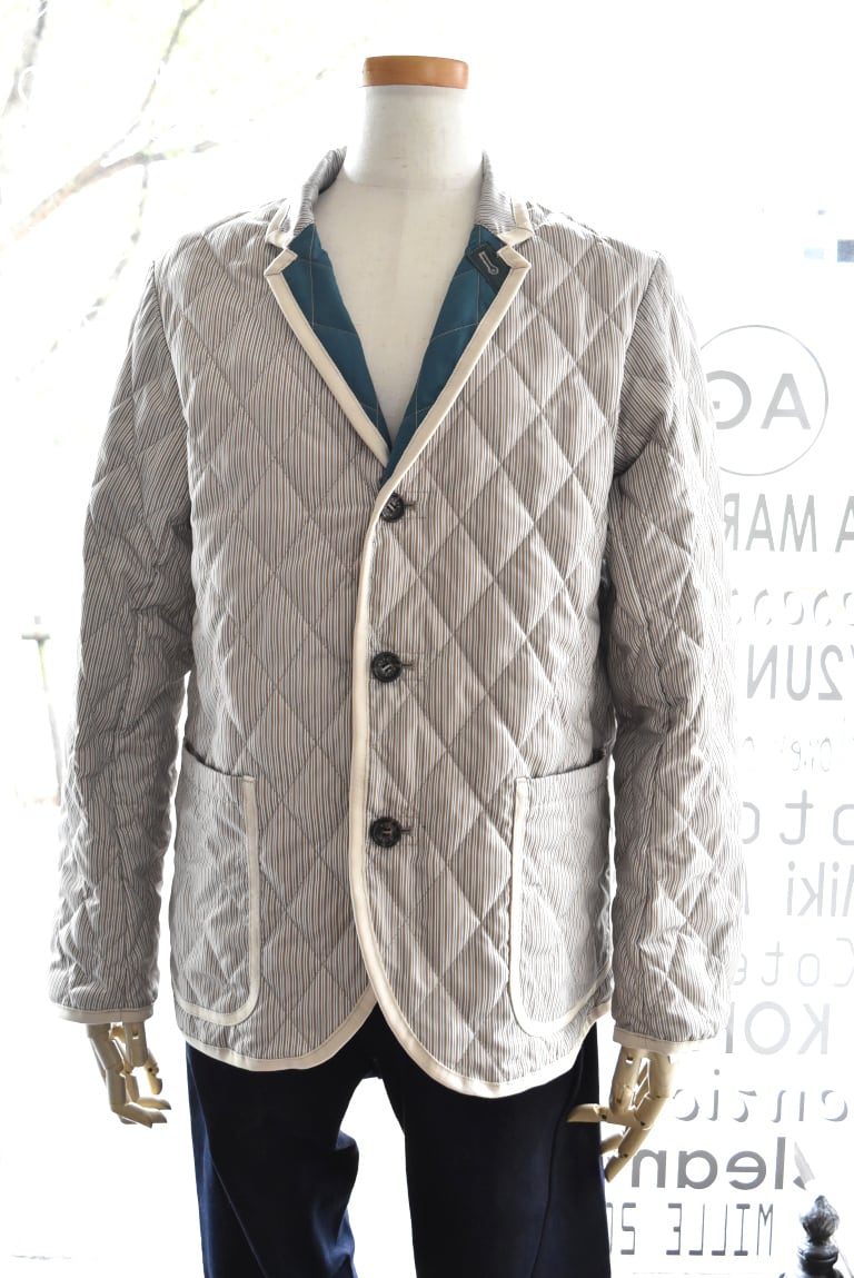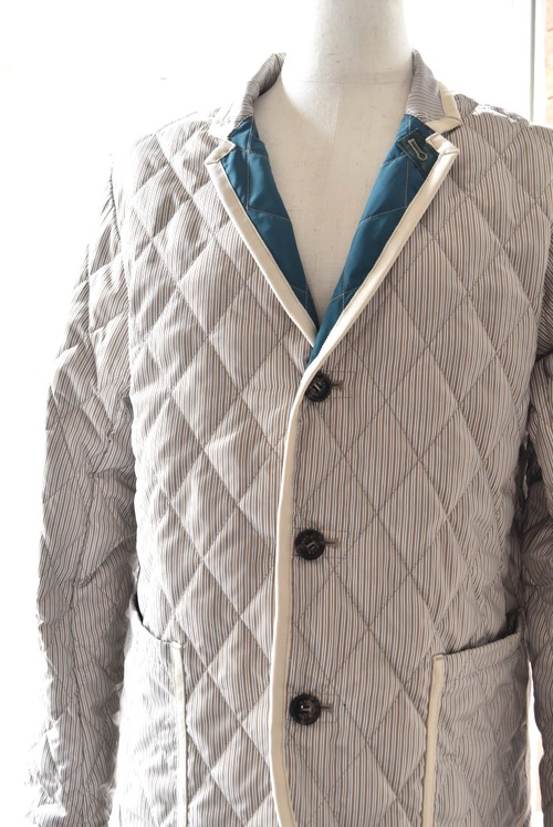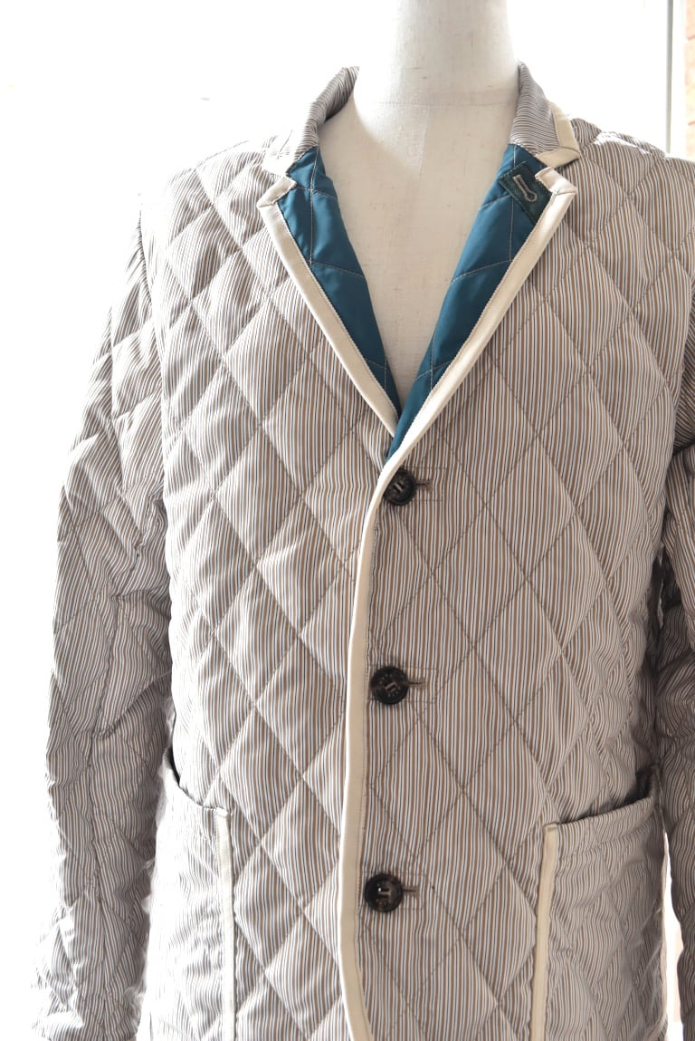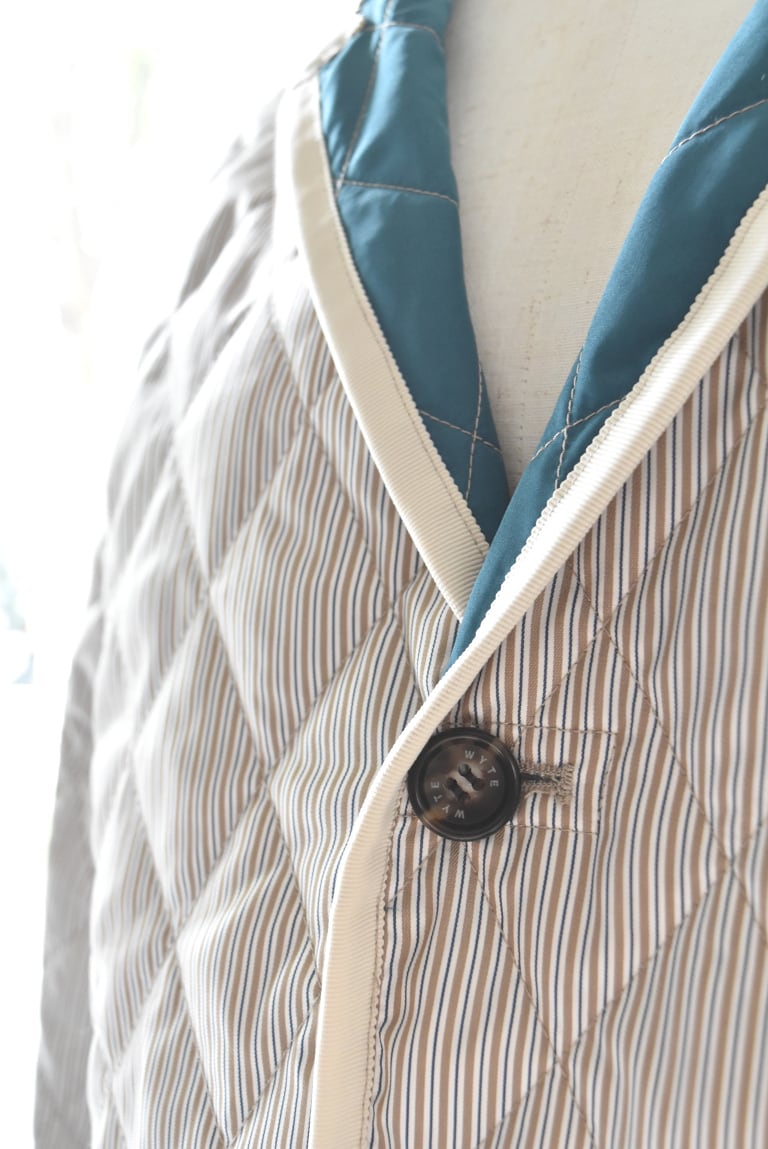 マルチストライプの軽量ナイロン素材に、ダウンパックを挟み、サンドイッチ状にキルト加工を施しています。