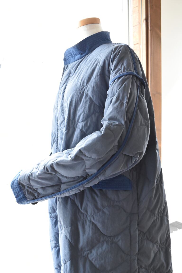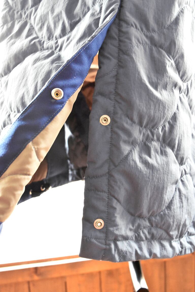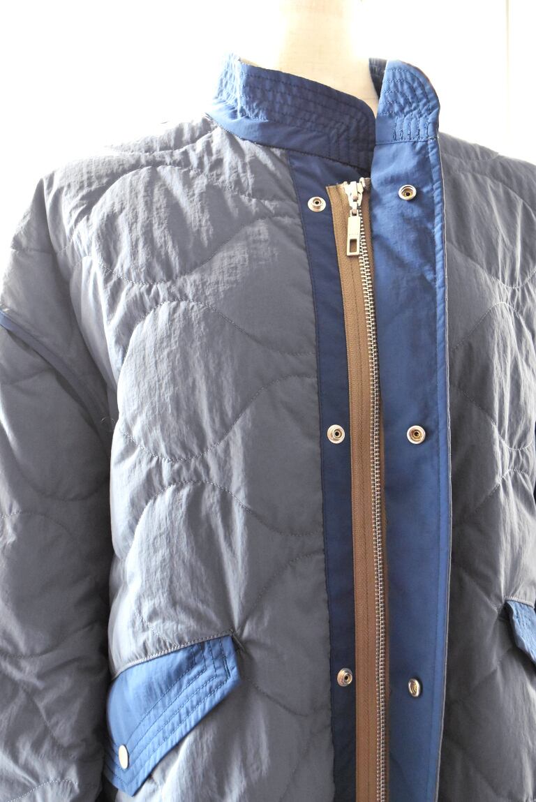 パウダリータッチの軽量ナイロン素材にダウンパックを挟み、サンドイッチ状にキルト加工を施しています。