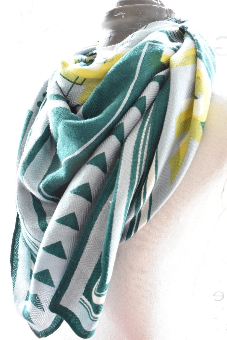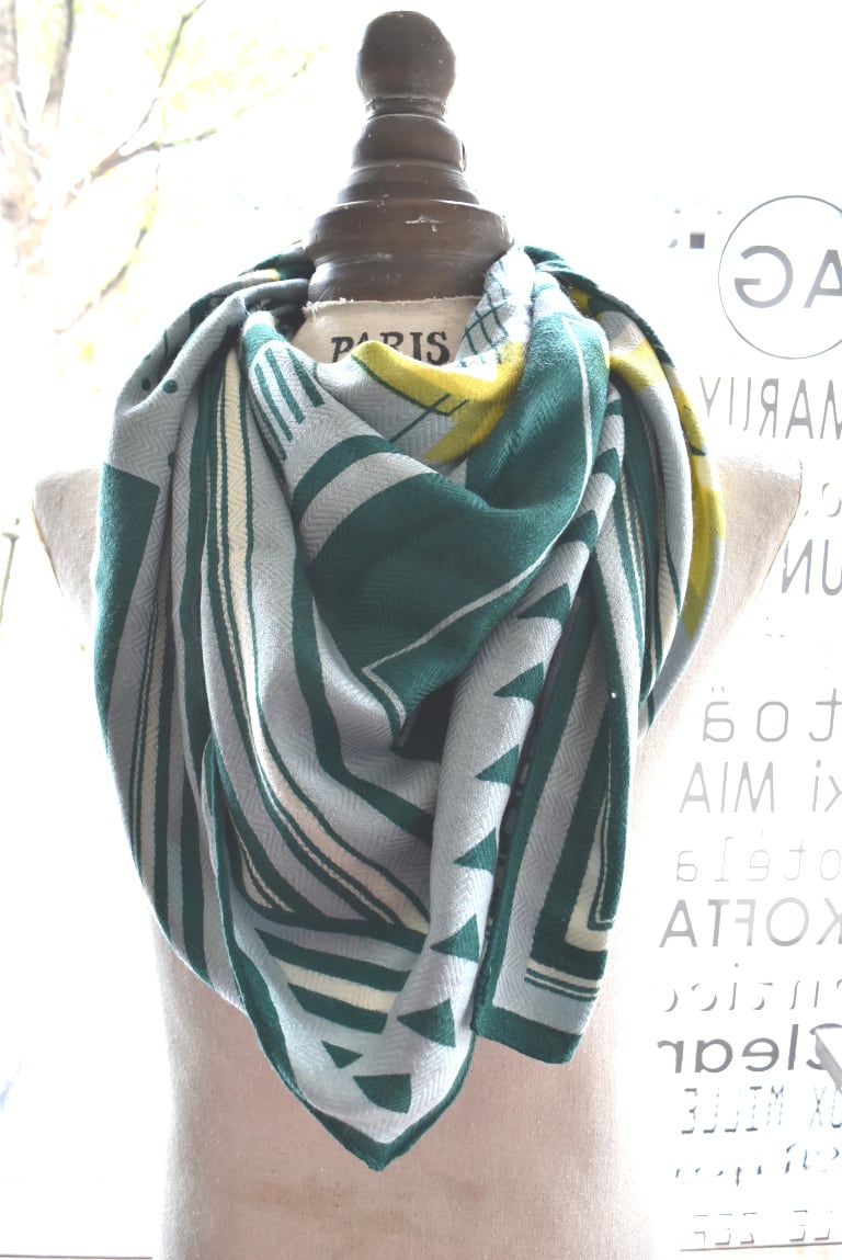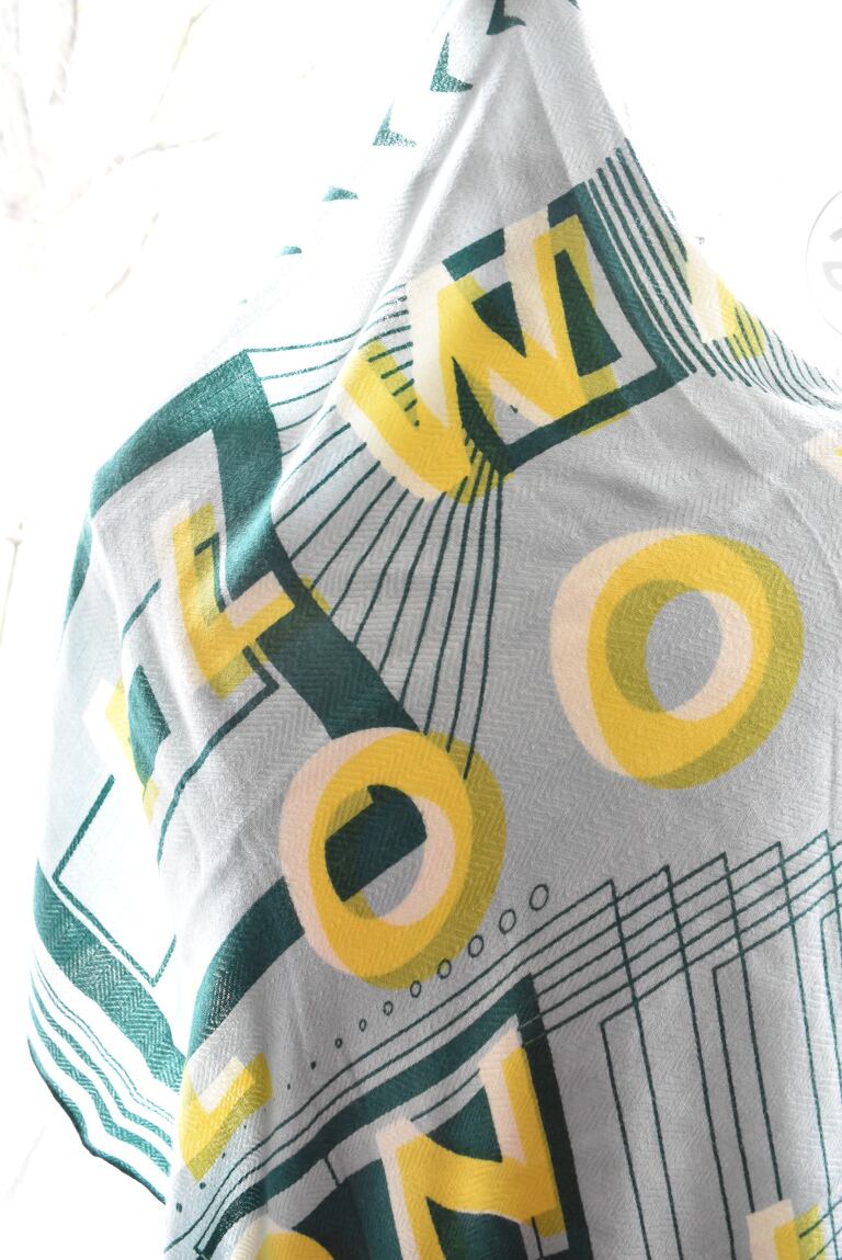 ヘリンボーン地にmanipuriのスカーフ柄がプリントされた色鮮やかなストール。