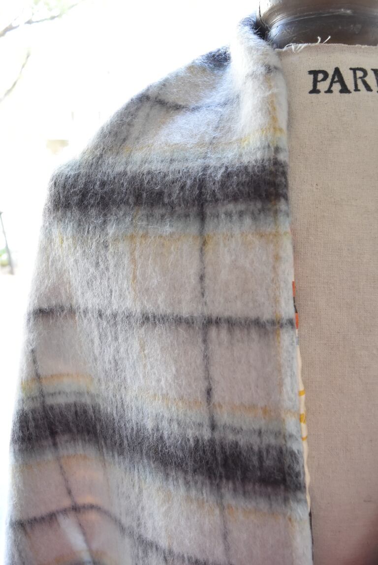 表地がシルク100%、裏地にはチェック柄のウール生地を使用した暖かいウールシルクマフラー。