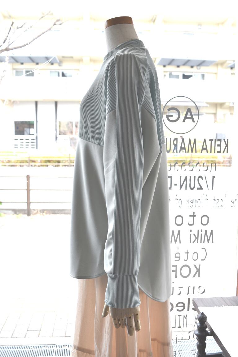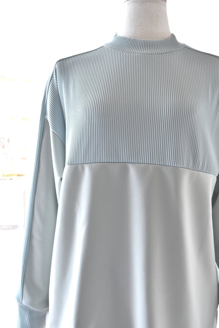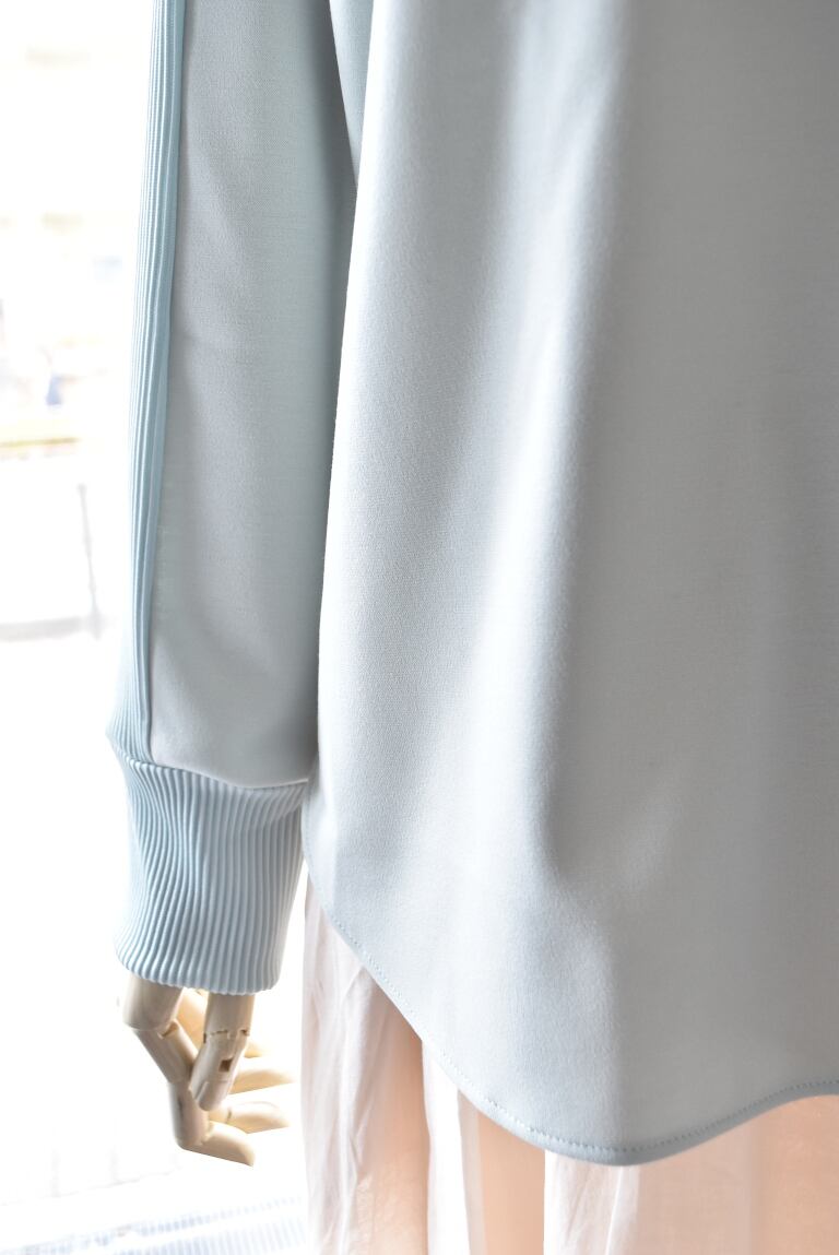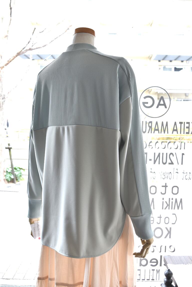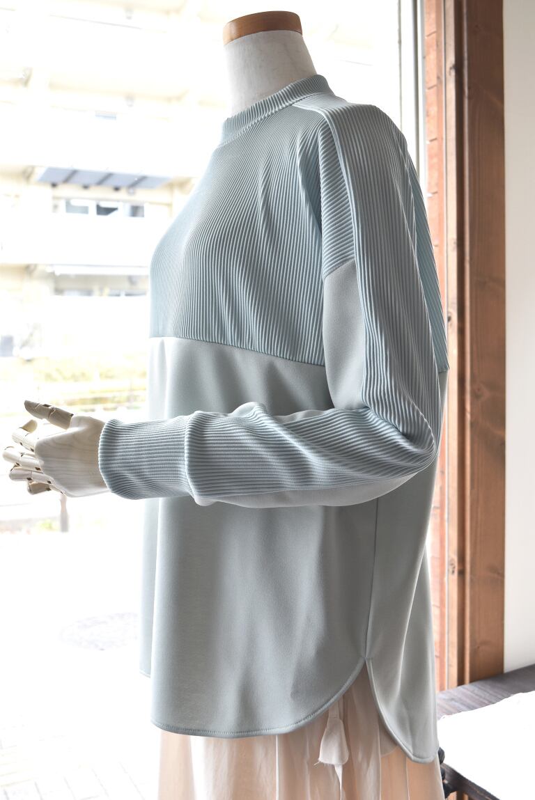 シアーリップルという透け感のあるカットソーと、レーヨン混の柔らかいポンチを組み合わせています。