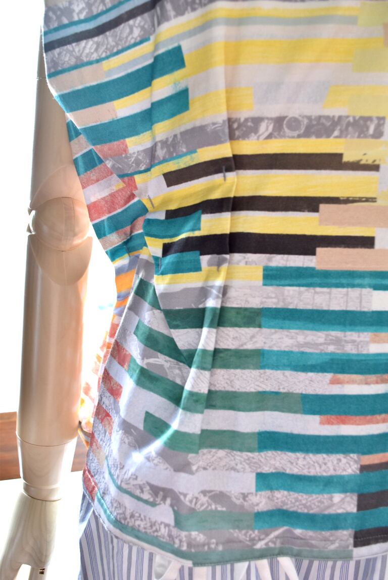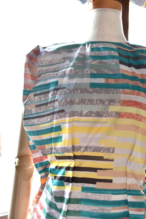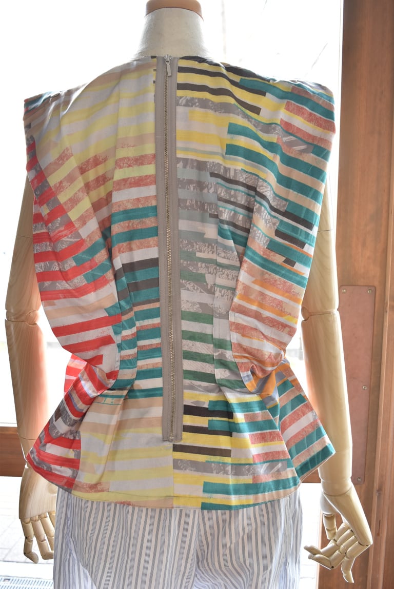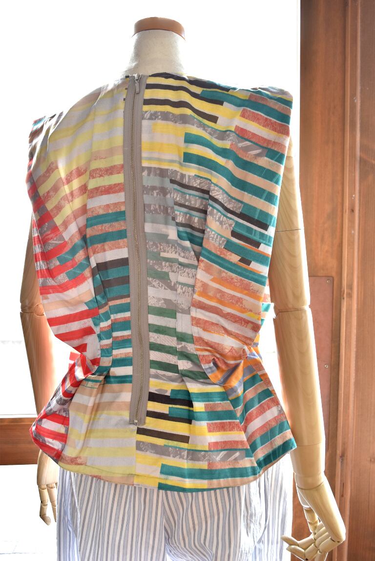腹痛のイメージを短冊状に切り取り、断片的に再構成したコラージュプリントは、視覚的なリズムと奥行きを生み出し、動きに合わせて多様な表情を見せます。