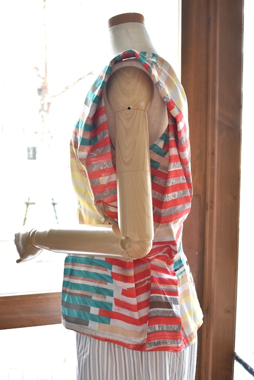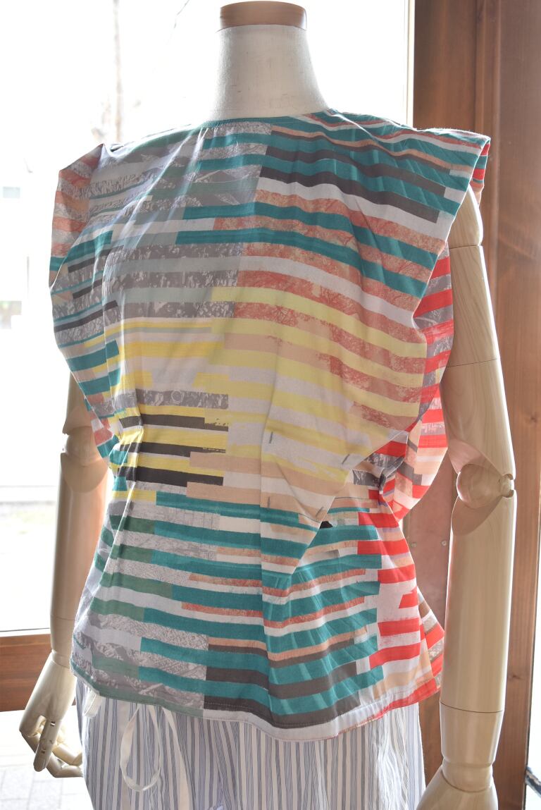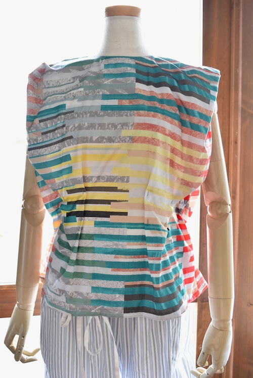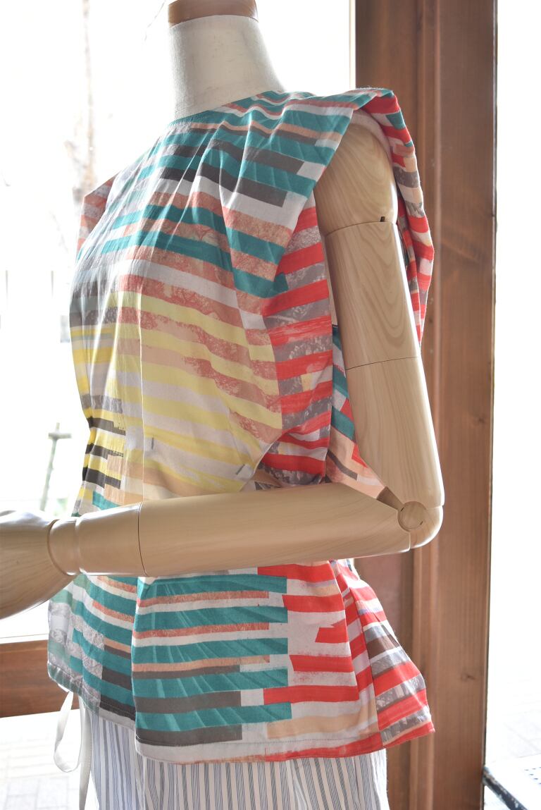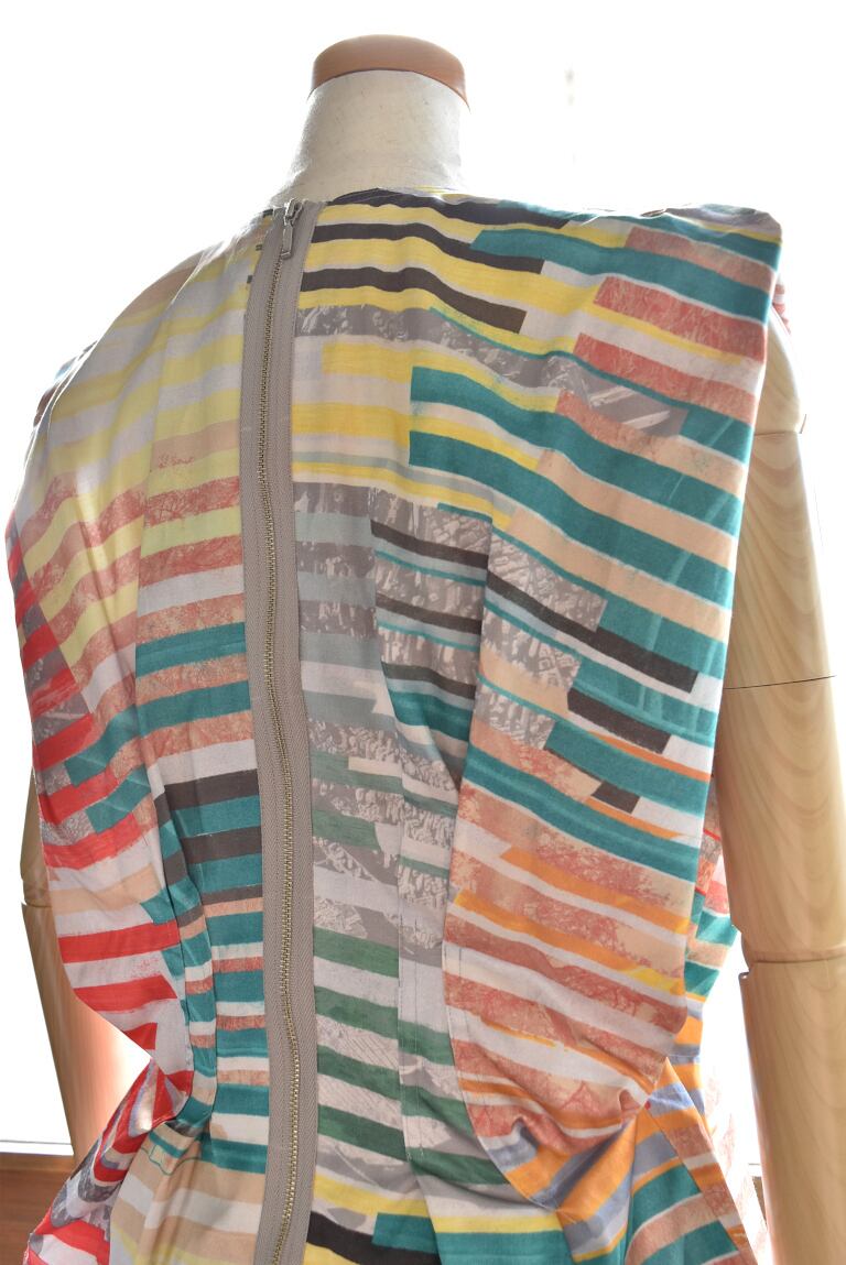 腹痛のイメージを短冊状に切り取り、断片的に再構成したコラージュプリントは、視覚的なリズムと奥行きを生み出し、動きに合わせて多様な表情を見せます。