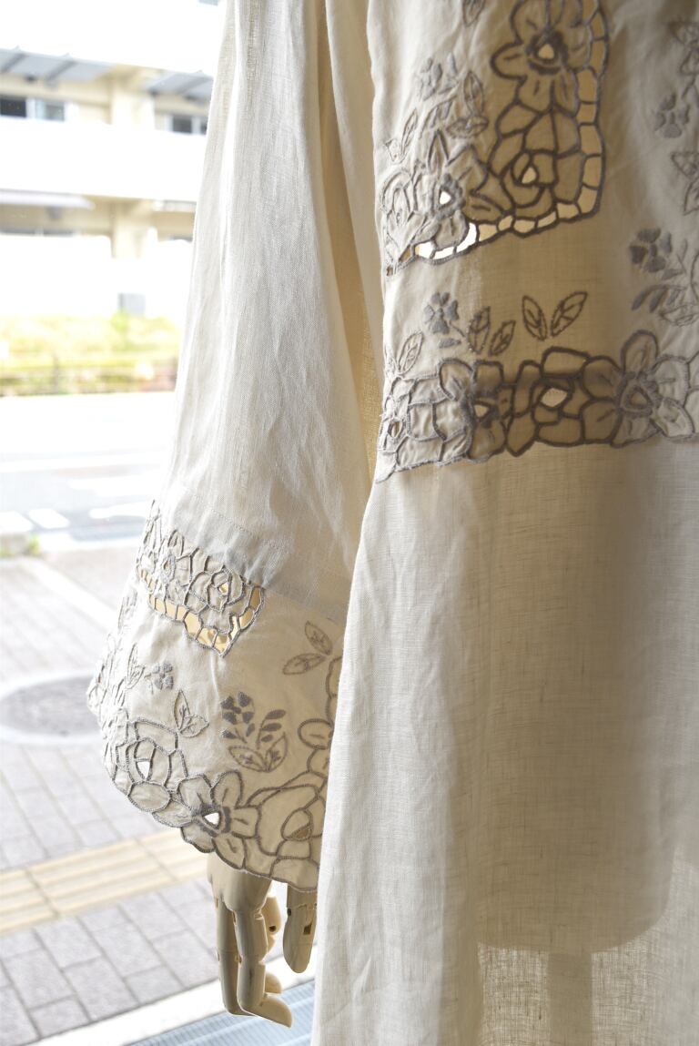 前ヨークと袖口に刺繍パーツを使用し、ウエストにタックが入っているデザイン。