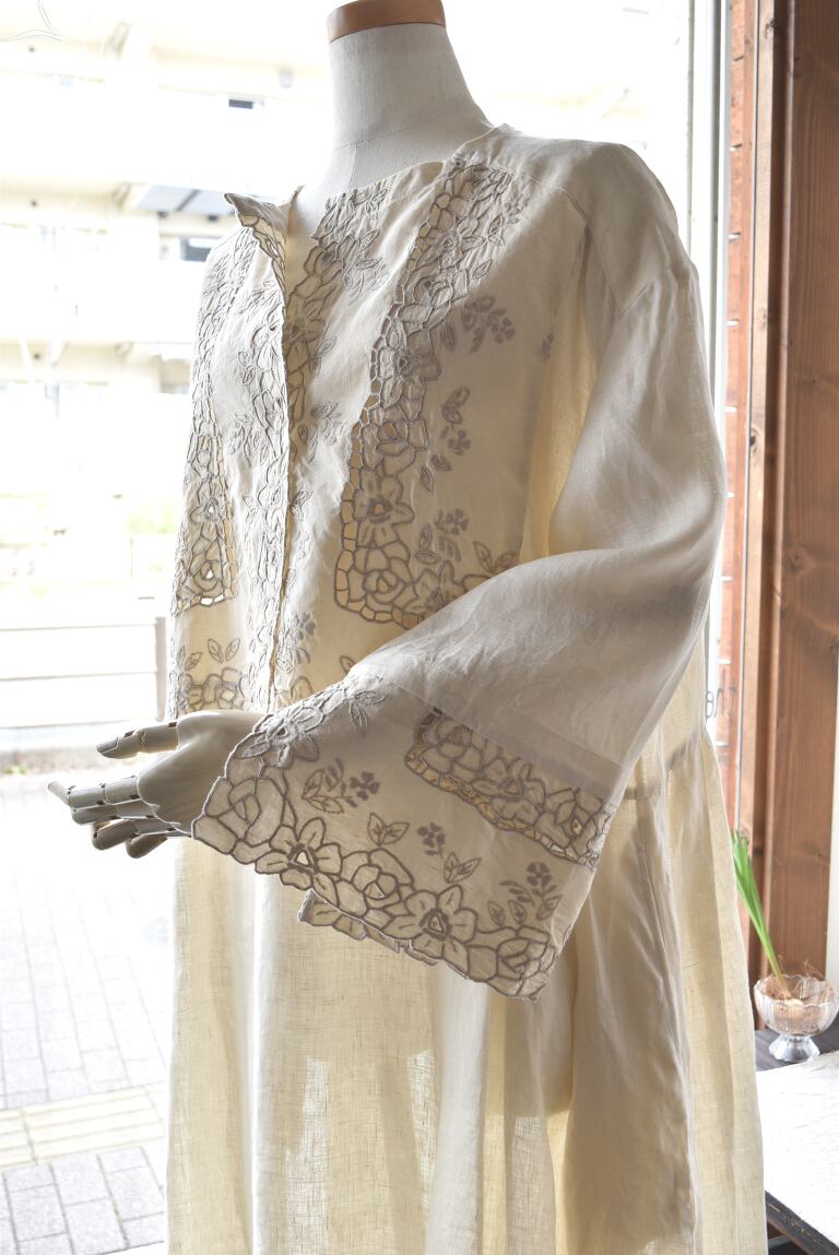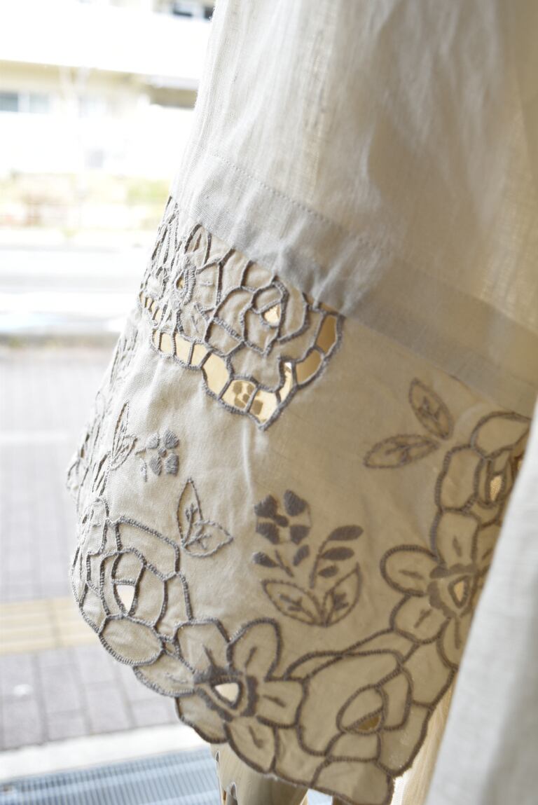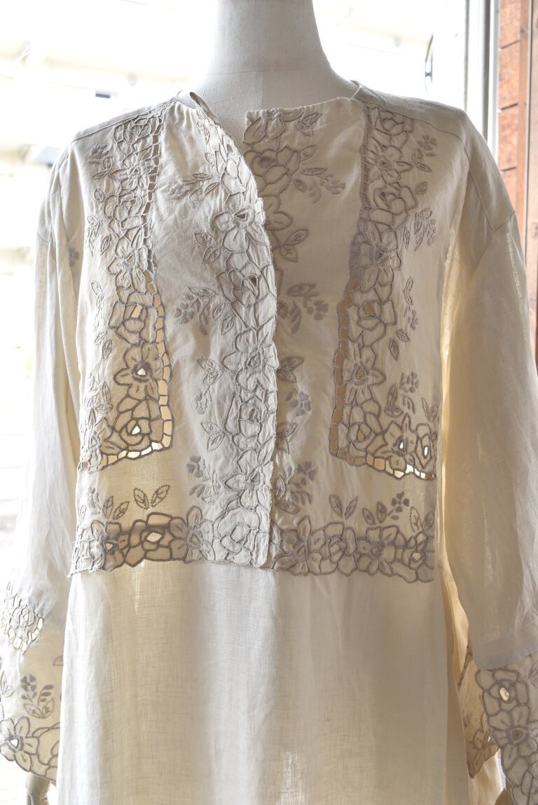 中国汕頭のデットストックのカットワークパーツをリメイクしたカフタンドレスです。
