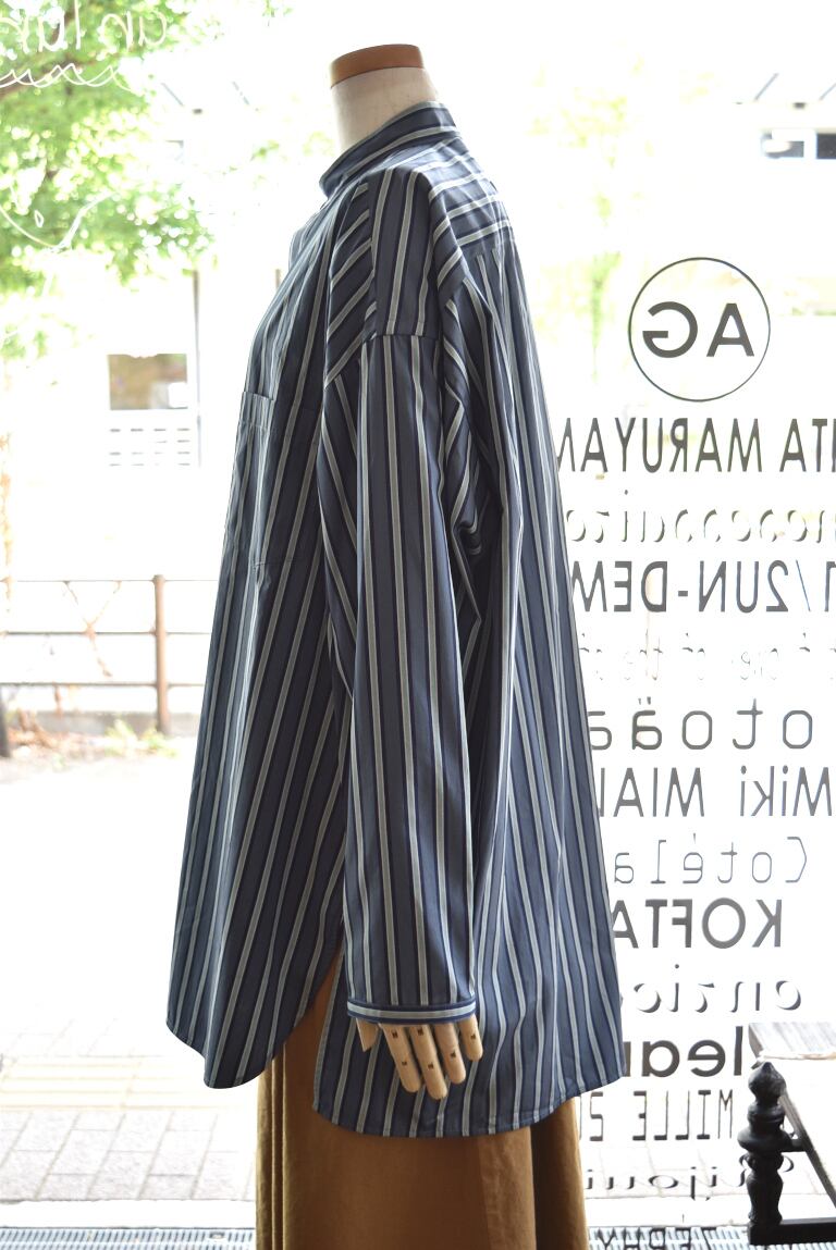 ハイネックのような新しいスタンドネックの形が知的な佇まいの前開きシャツです。
