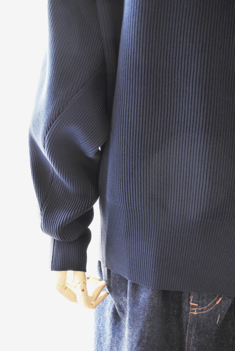 素材の特徴を活かしハリ感のある畦編みで仕上げたニットウェアは、サイドを別パーツに切り替える事で立体的で女性らしさたっぷりの丸みシルエットに。