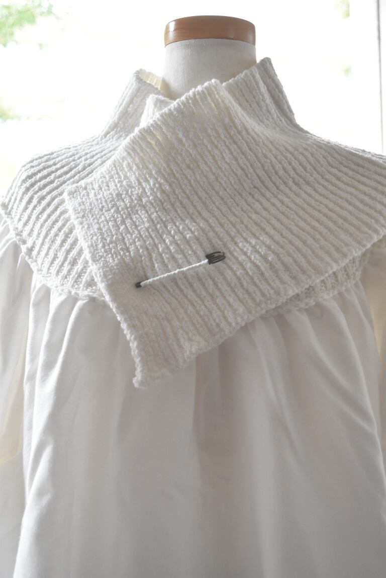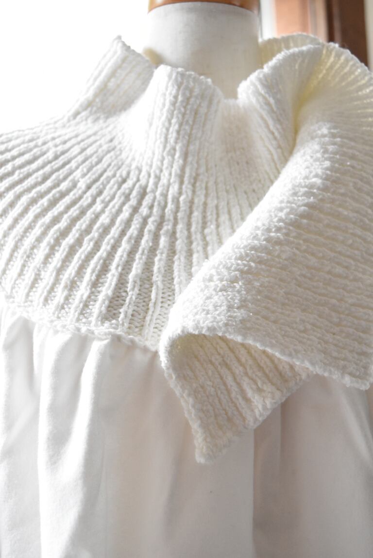 付属のニットピンを使ってリブの長さを調節でき、オフショルにしたり首あたりまであげてタートルのようにと、何通りもの着用を楽しめます。