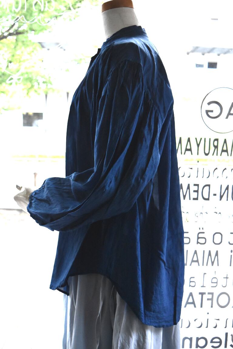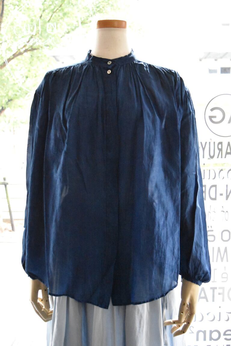 藍染を施したコットンシルク素材のギャザーブラウス。