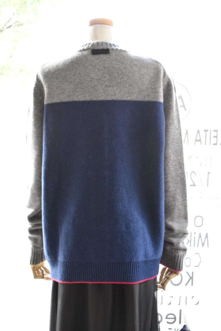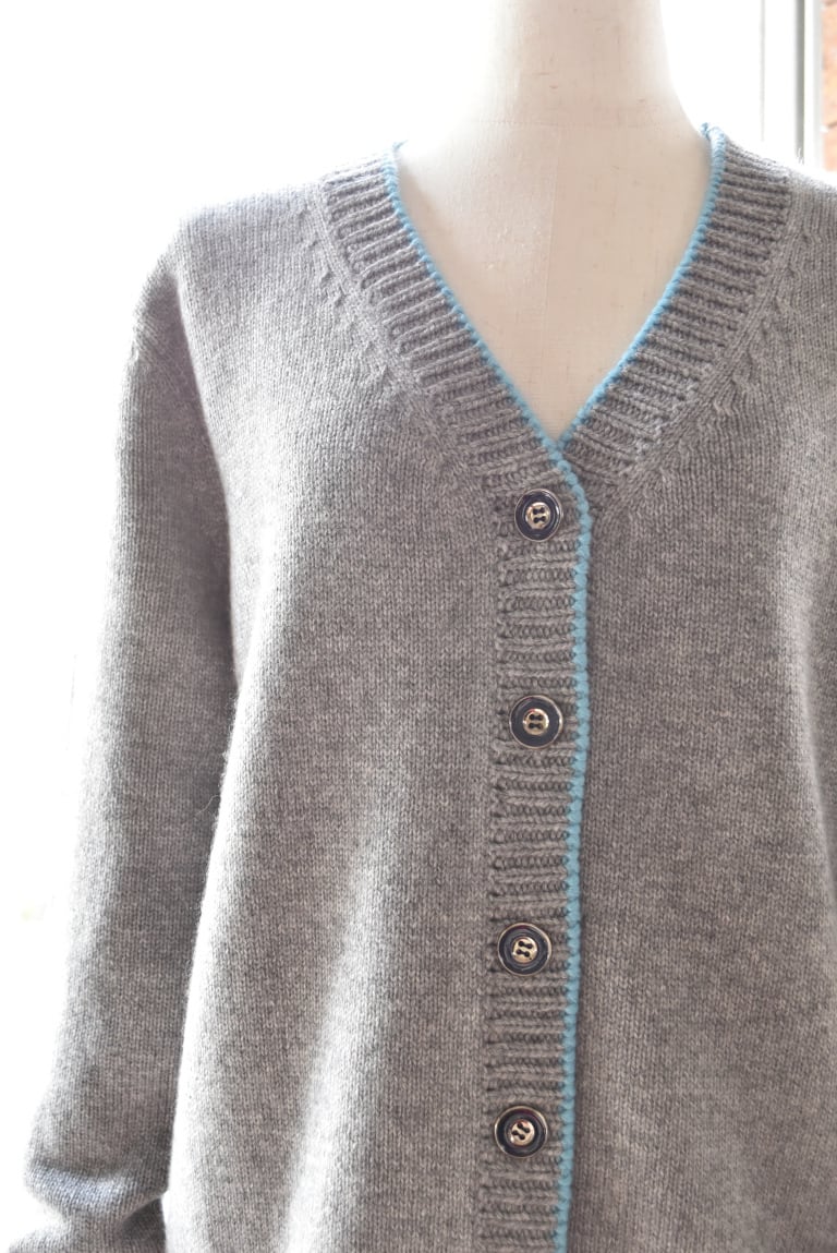 衿、前立て、袖口、裾のカシミヤリブには細部のライン配色。